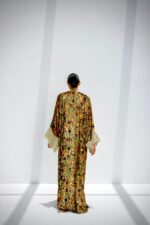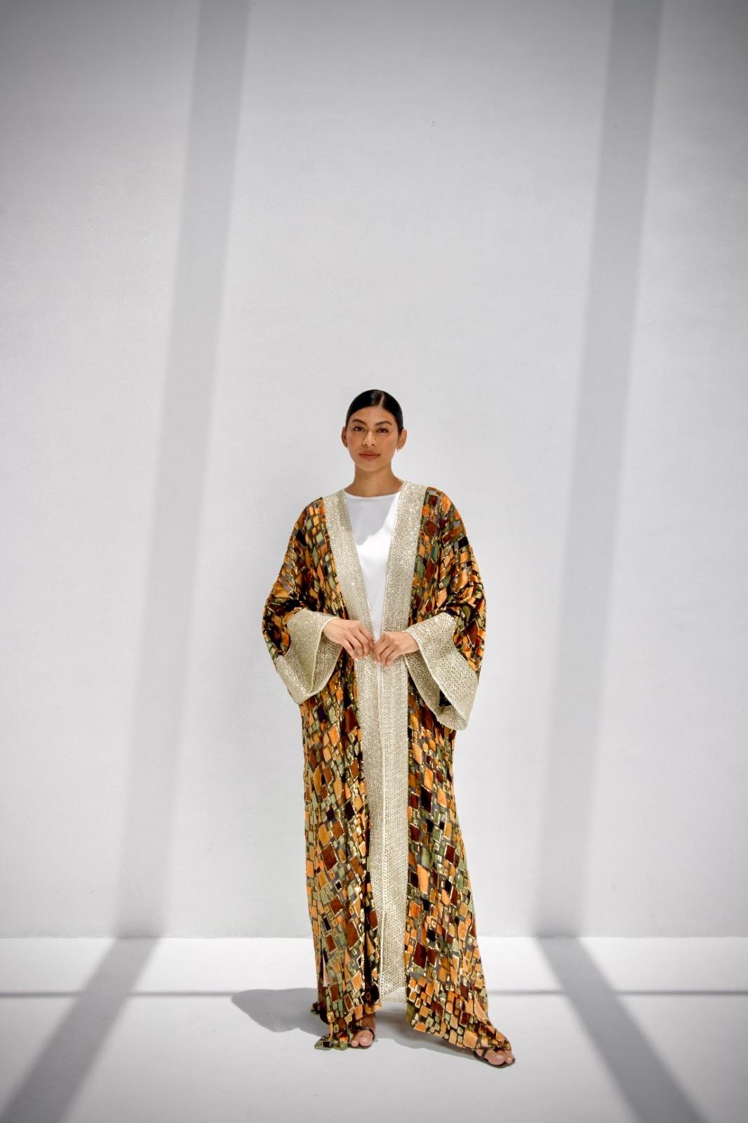 Fabric: Lightweight chiffon with silk-touch velvet appliqués, metallic gold embroidery, and shimmer-embroidered sleeve panels