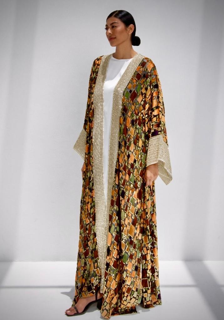 A refined A-line abaya crafted from premium lightweight chiffon, delicately embroidered with soft, silk-touch velvet appliqués.